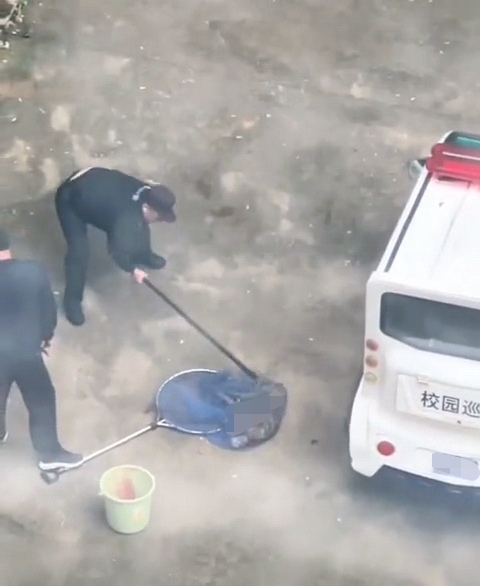 据学生拍摄的现场视频显示,一只小狗被网兜困住,一名黑衣男子用脚踩住网兜连杆防止其挣脱,随后一名身着保安制服的男子手持棍棒,对着被困小狗用力猛击。紧接着,又一名穿红衣的中年女子手持木棒走近,朝着小狗头部又补击了数下。